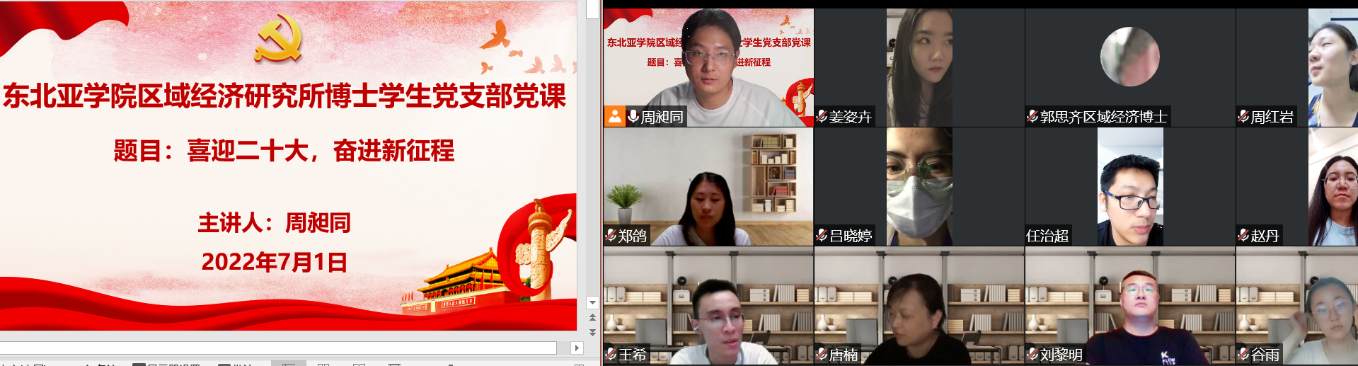 历史与文化研究所博士学生党支部书记刘颜青以 “做新时代不忘初心的合格党员,以优异成绩迎接党的二十大召开”为题讲党课,世界经济研究所博士学生党支部书记王天尧以“喜迎二十大,做新时代合格党员”为题讲党课,带领大家加深对党员身份的理解,号召大家把自己的人生理想与祖国、与时代紧紧联系在一起,做新时代的社会主义事业建设者和接班人,以更强的历史责任感和使命感,不负党对年轻人的无限厚望,让青春与党同行。